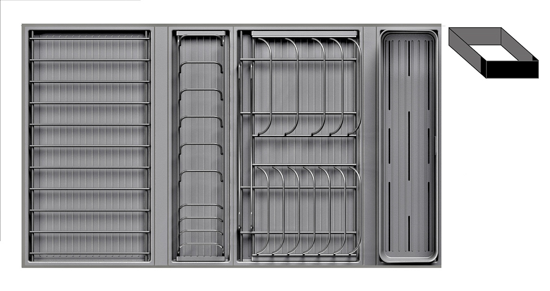 1 для столовых приборов (состоит из: 1 х емкость пластиковая 400 х 100 х 120 мм, 1 х поддон пластиковый 423 х 124 мм)