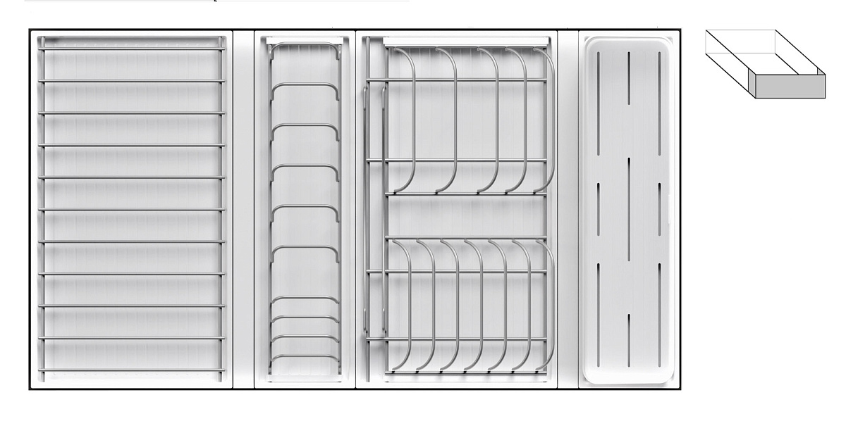 1 для столовых приборов (состоит из: 1 х емкость пластиковая 400 х 100 х 120 мм, 1 х поддон пластиковый 423 х 124 мм)